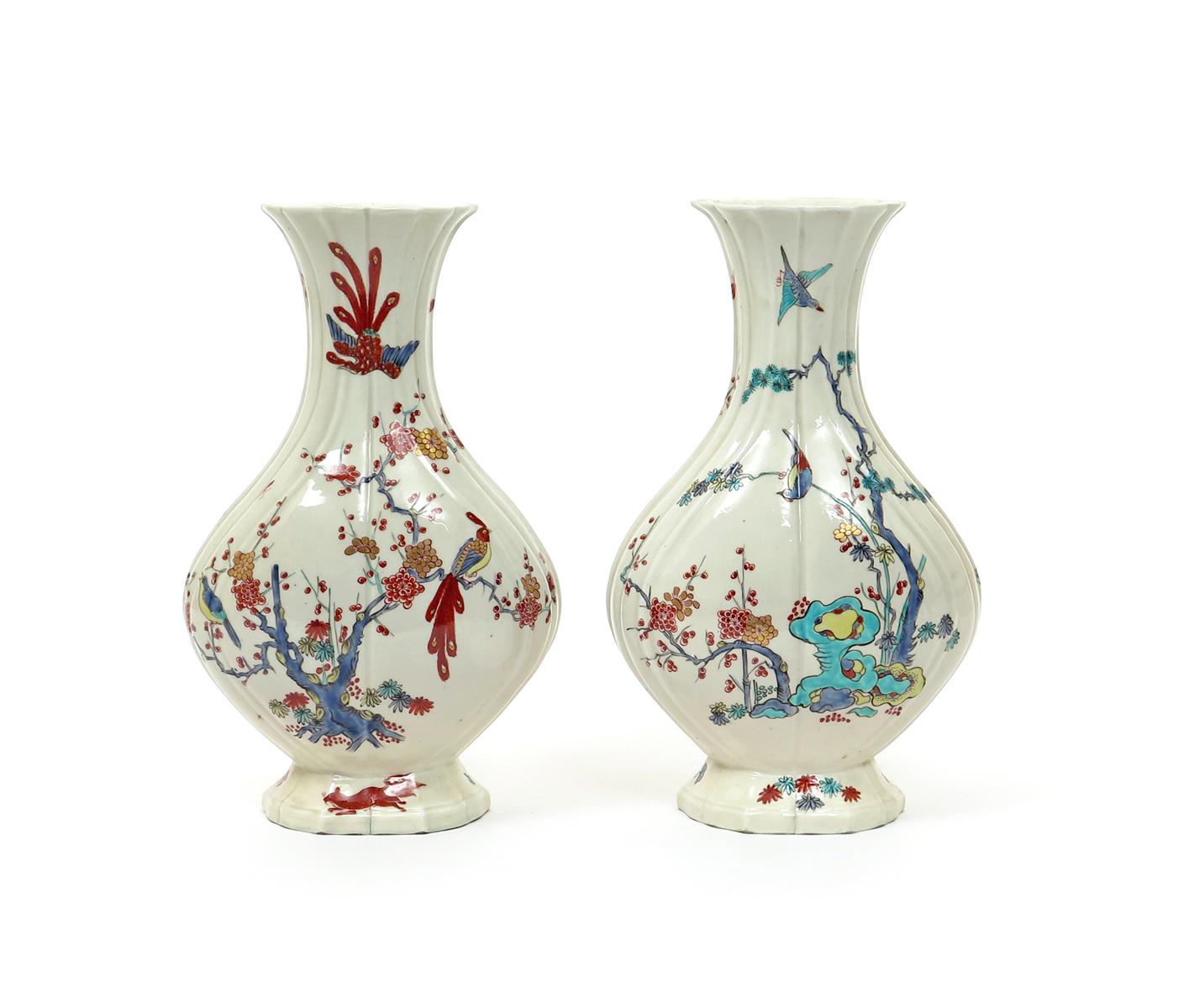 A pair of Samson Chantilly-style vases late 19th century, the flattened moulded forms painted in the Kakiemon palette, with two scenes of long-tailed birds on and above flowering prunus branches, one side with a squirrel scampering around the base, red horn marks, both drilled, 27.8cm. (2)