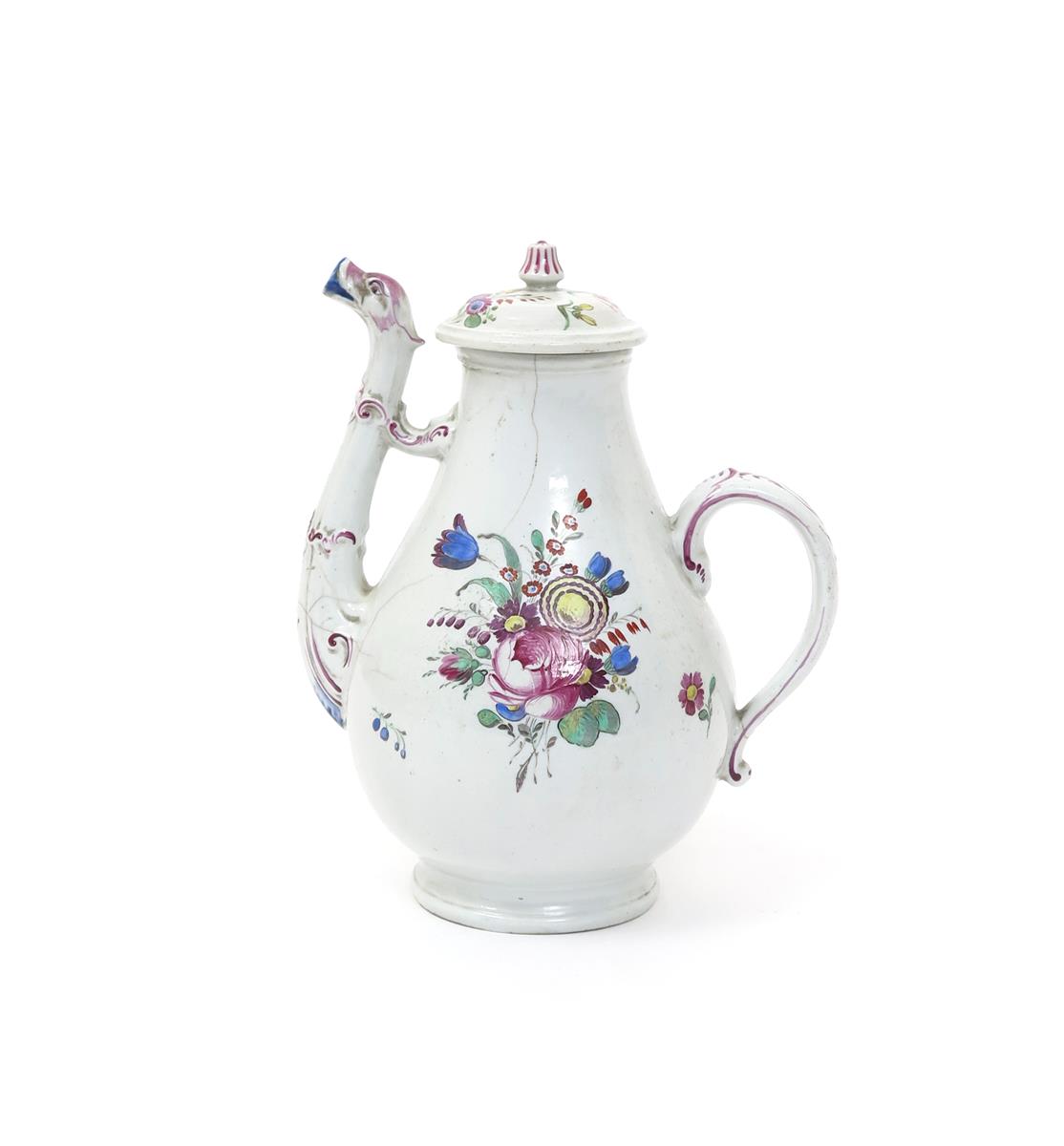 A Doccia coffee pot and cover c.1770, painted with sprays of European flowers including rose and tulip, the spout moulded as a mythical beast, picked out with puce scrollwork, some damages, 21.5cm. (2)
