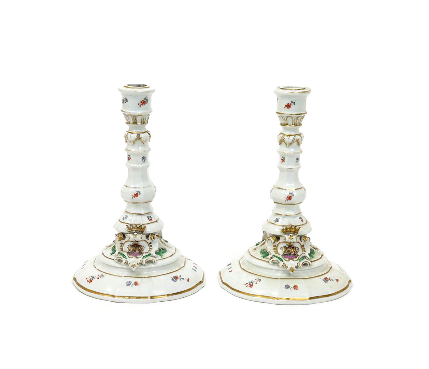 A pair of Meissen-style candlesticks late 19th century, of faceted form, applied with crowned armorial shields and painted with sprays of Kakiemon flowers, pseudo blue crossed swords and star marks, one sconce broken off and restuck, 24cm. (2)