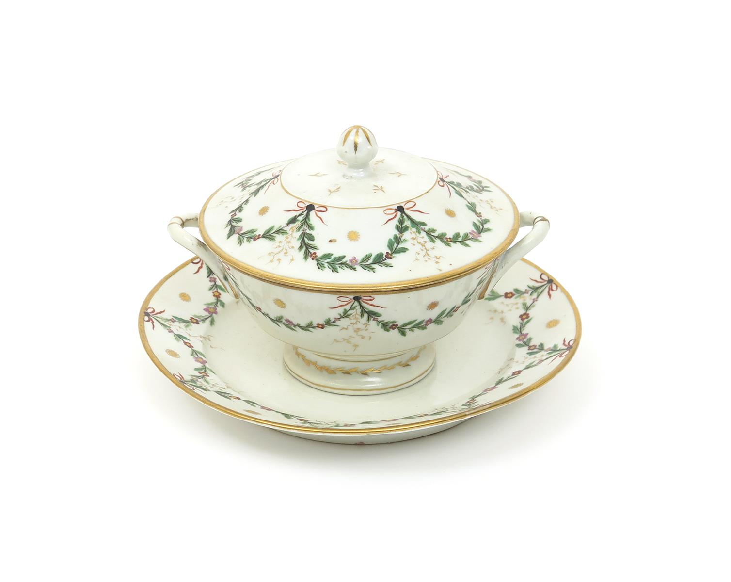 A Paris porcelain tureen with cover and stand late 18th/early 19th century, of circular form, painted with leafy swags suspended from tied red ribbons, with small gilt foliate motifs, one handle restored, 23cm. (3)
