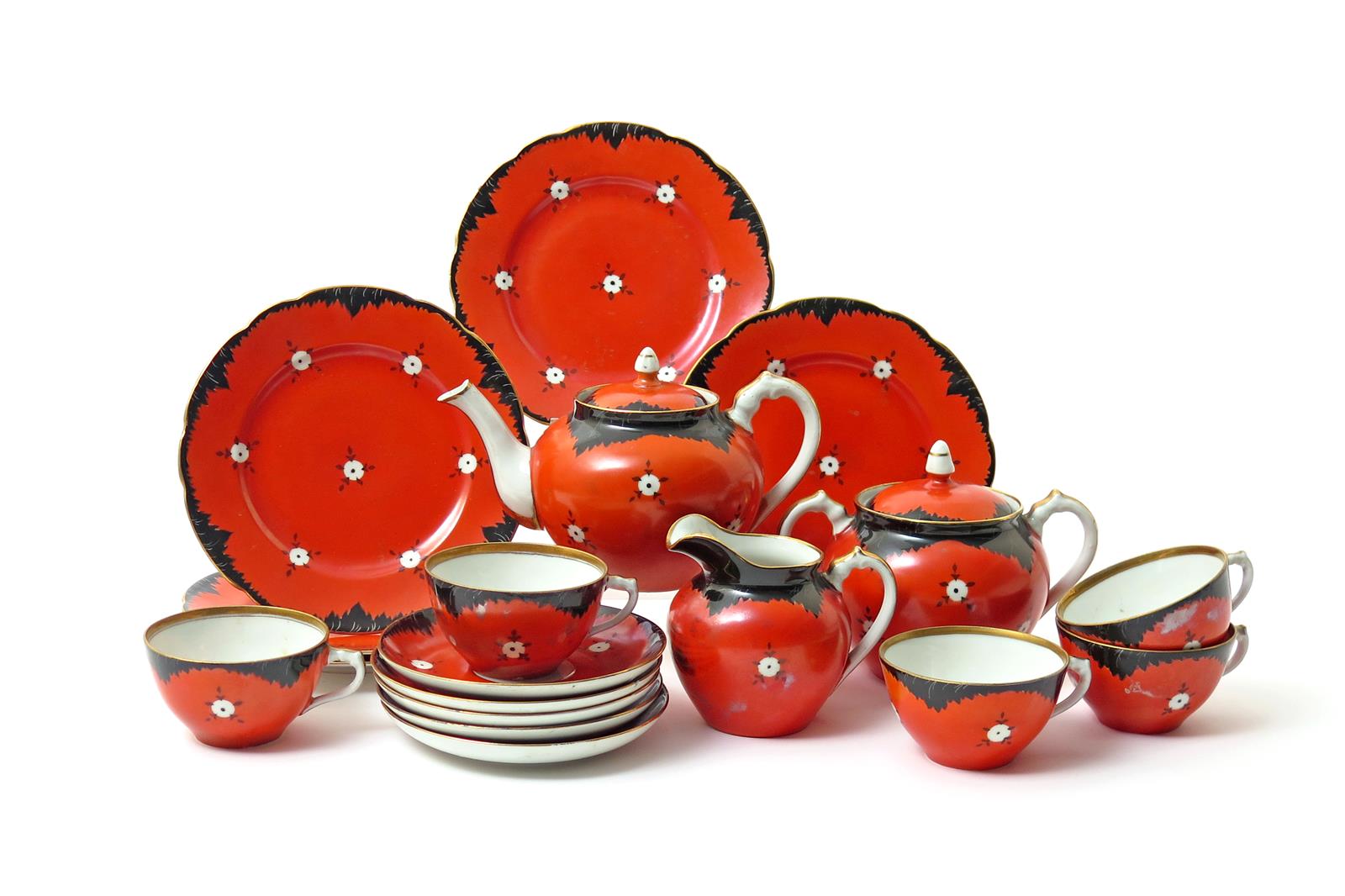 A Russian porcelain Soviet era part tea service c.1930, decorated with small white and black flowers on a bright orange red ground within shaped black borders, printed Moscow marks. Comprising: a teapot and cover, a milk jug, a sucrier and cover, five plates, five saucers and five cups. (20)