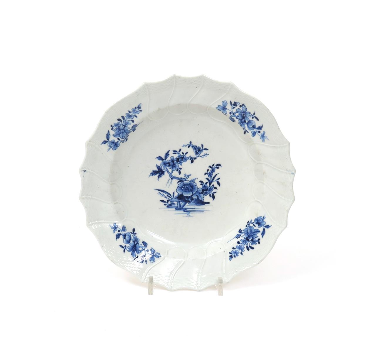 A Tournai blue and white plate c.1780, painted with the Ronda pattern of prunus and peony issuing from low rockwork, the rim with four sprays of Oriental flowers, blue crossed swords and + mark, 24cm.