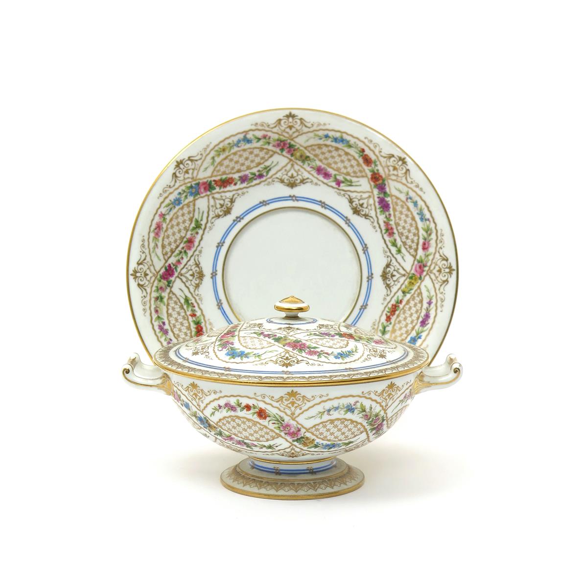 A Sèvres ecuelle with cover and stand 2nd half 19th century, painted with interlocking garlands of flowers enclosing gilt diaper panels within stylized foliate motifs, cancelled marks, 22.8cm. (3)
