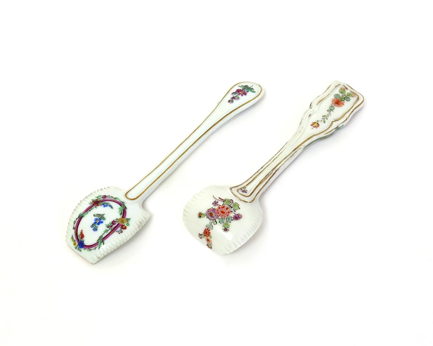 Two Meissen butter curlers or spoons mid 18th century, the curved bowls with a serrated surface, one painted to the reverse with small sprigs of deutscheBlumen within a puce border garlanded with leaves and further flowers, the other with sprays of indianischeBlumen, the scrolled edge highlighted in gilt, the latter restored through the stem 15.3cm max. (2)