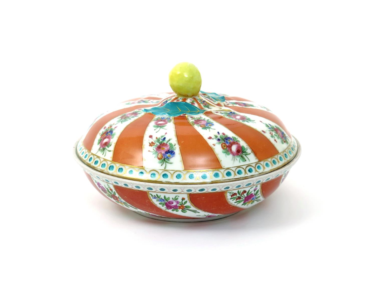 A Meissen tureen and cover for the Turkish market c.1780-1800, the flattened circular form painted with spiral panels of flowers alternating with bold orange stripes, surmounted with a lemon finial, with further bold sprays of flowers to the interior, blue crossed swords and star mark for the Marcolini period, 20.8cm dia. (2)