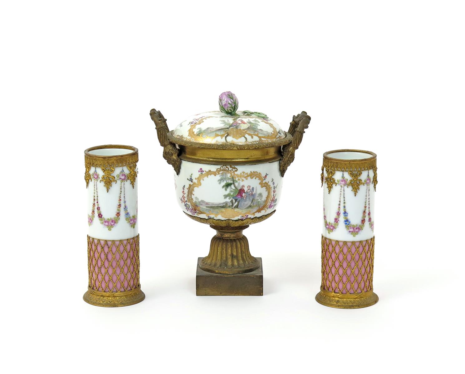 A pair of Sèvres-style cylindrical vases 19th century, decorated with garlands of flowers and a wide pink band behind pierced ormolu mounts, pseudo blue interlaced LL marks, and a Meissen style ormolu-mounted bowl and cover, painted with panels of courting couples and other figures within gilt scroll cartouches, amidst scattered flowers, the cover broken and restored, 20.5cm max. (4)