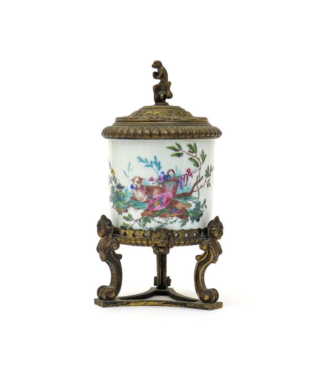 A French porcelain ormolu-mounted toilet pot and cover 18th century, painted in the Sèvres manner with a sheep wearing a blue ribbon, recumbent beside a basket and a pink hat, the reverse with birds in flight, sitting into an ormolu base with term feet, the cover surmounted with a monkey finial, disguised interlaced LL mark, 16.5cm. (3)