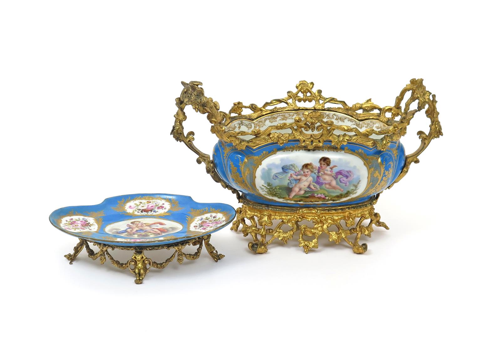 A Sèvres style ormolu-mounted jardinière 19th century, painted to one side with two putti garlanded with flowers, the reverse with a large panel of flowers, reserved on a turquoise ground, mounted to the rim and foot with elaborate gilt metal scrollwork, and a quatrefoil stand with similar decoration, mounted on an ormolu base, 41.5cm max. (2)