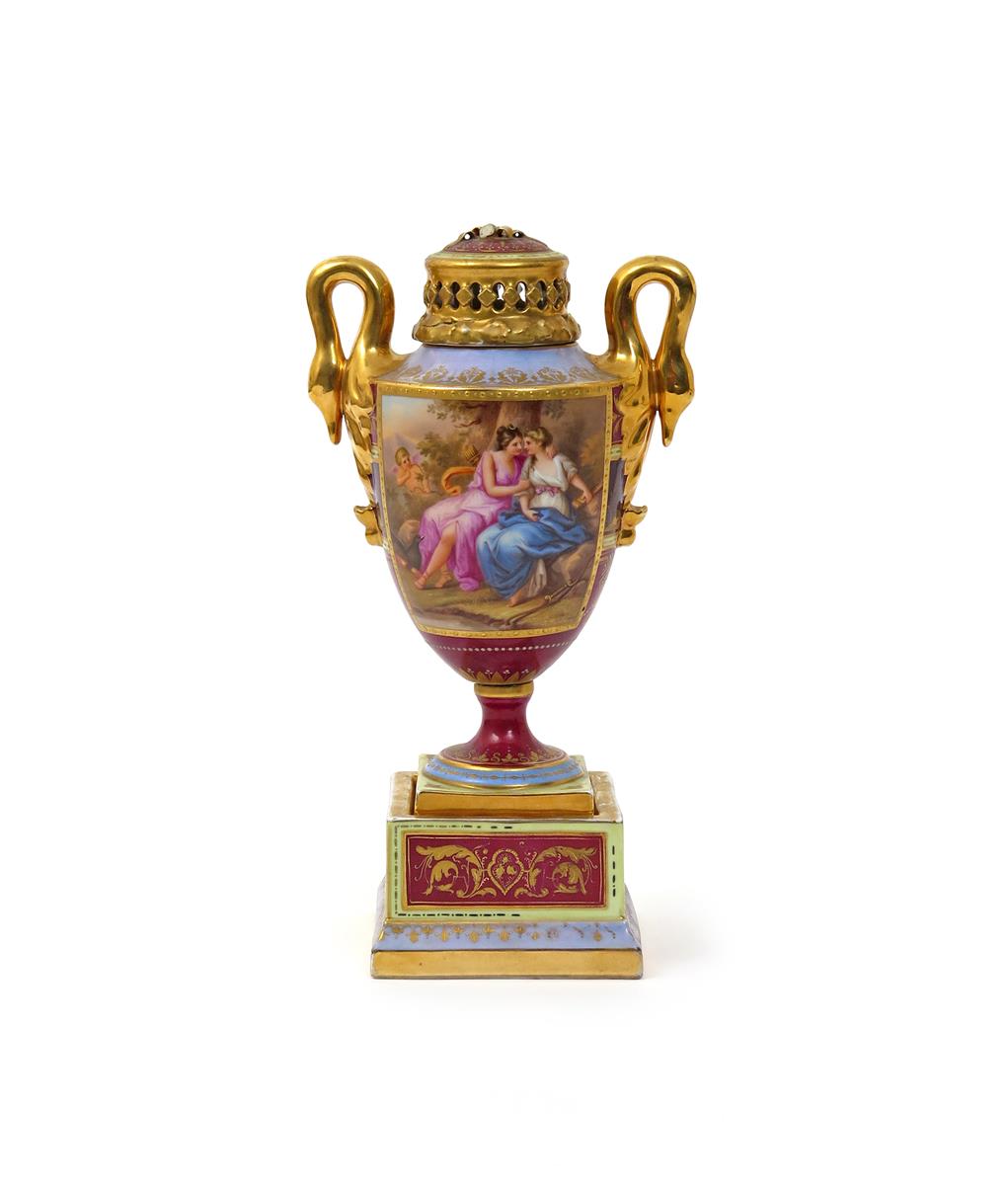 A Vienna-style vase with cover and stand 19th century, painted with Cupid spying on two maidens with quivers of arrows, reserved on a rich ground of coloured panels with formal gilt designs, the shoulders with swan head handles, raised on a square base, blue pseudo shield mark, the cover broken and repaired, 30.5cm. (3)