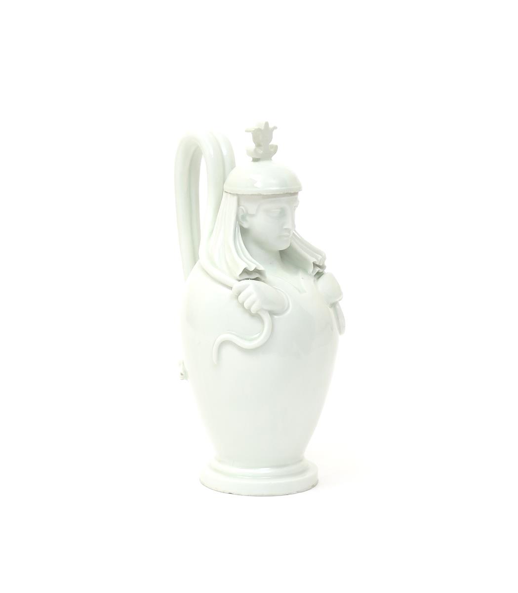 A Vienna jug and cover 2nd half 18th century, modelled in the Neoclassical manner as a figure wearing a plumed helmet, holding the scrolled ends of the tall handle formed of two snakes, restoration to the cover, 21.5cm. (2)