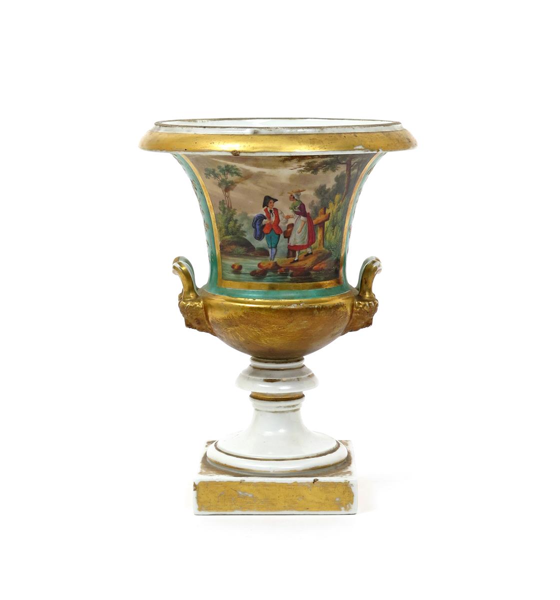 A Paris porcelain two-handled vase 19th century, of campana form, painted to one side with a gentleman in a bicorn hat, holding the hand of a rustic girl in a white apron, the reverse with a landscape, reserved on a green ground, some gilt wear, 28.5cm.