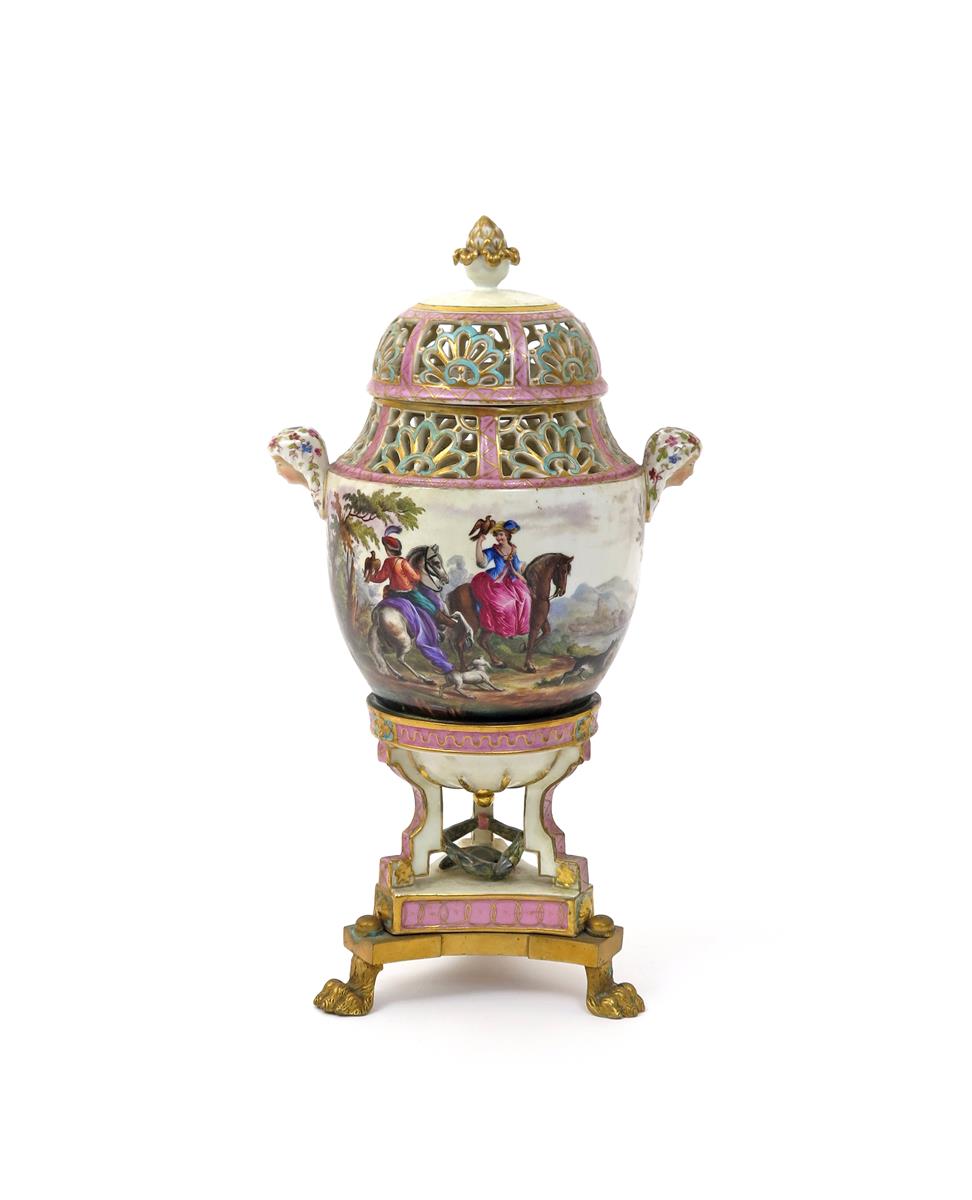 A Continental porcelain pot pourri vase and cover 19th century, painted with a continuous scene of a stag hunt, with two figures on horseback holding falcons while dogs run on ahead, the shoulder and cover pierced with a flowerhead design picked out in pink, turquoise and gilt, raised on an ormolu tripod base, some restoration, 35.5cm. (2)
