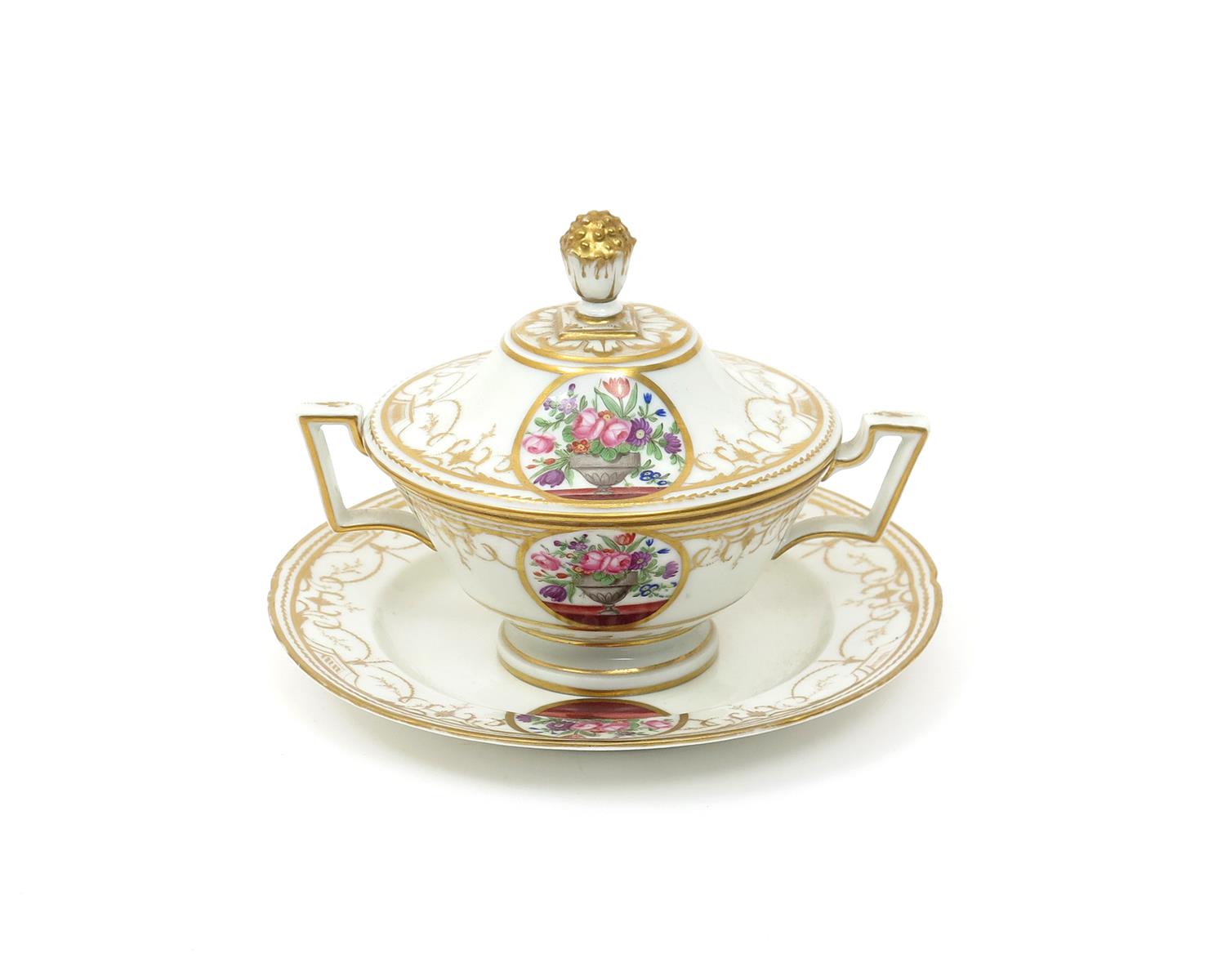 A Paris porcelain (Nast) ecuelle with cover and stand late 18th century, painted with panels containing vases of flowers resting on a table top, within stylized gilt formal borders, printed NAST to the stand, 19cm. (3)