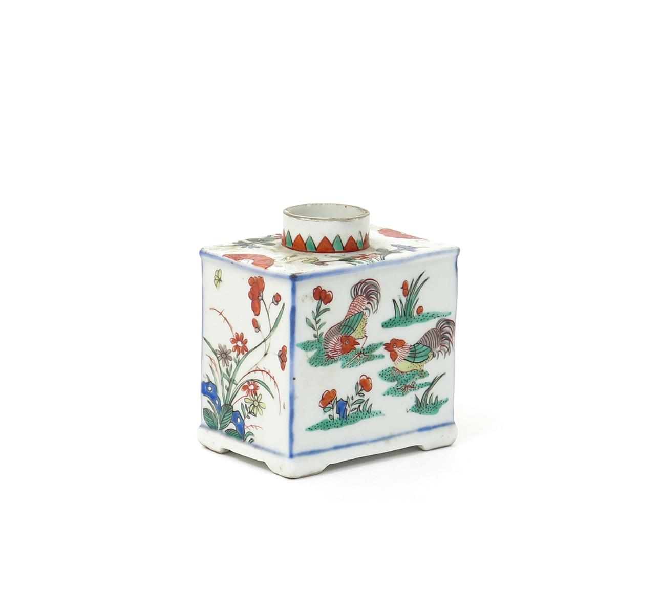 A Samson porcelain tea canister late 19th century, the rectangular form painted in the Chinese famille verte manner with confronting cockerels amidst flowering branches, 8.2cm high.