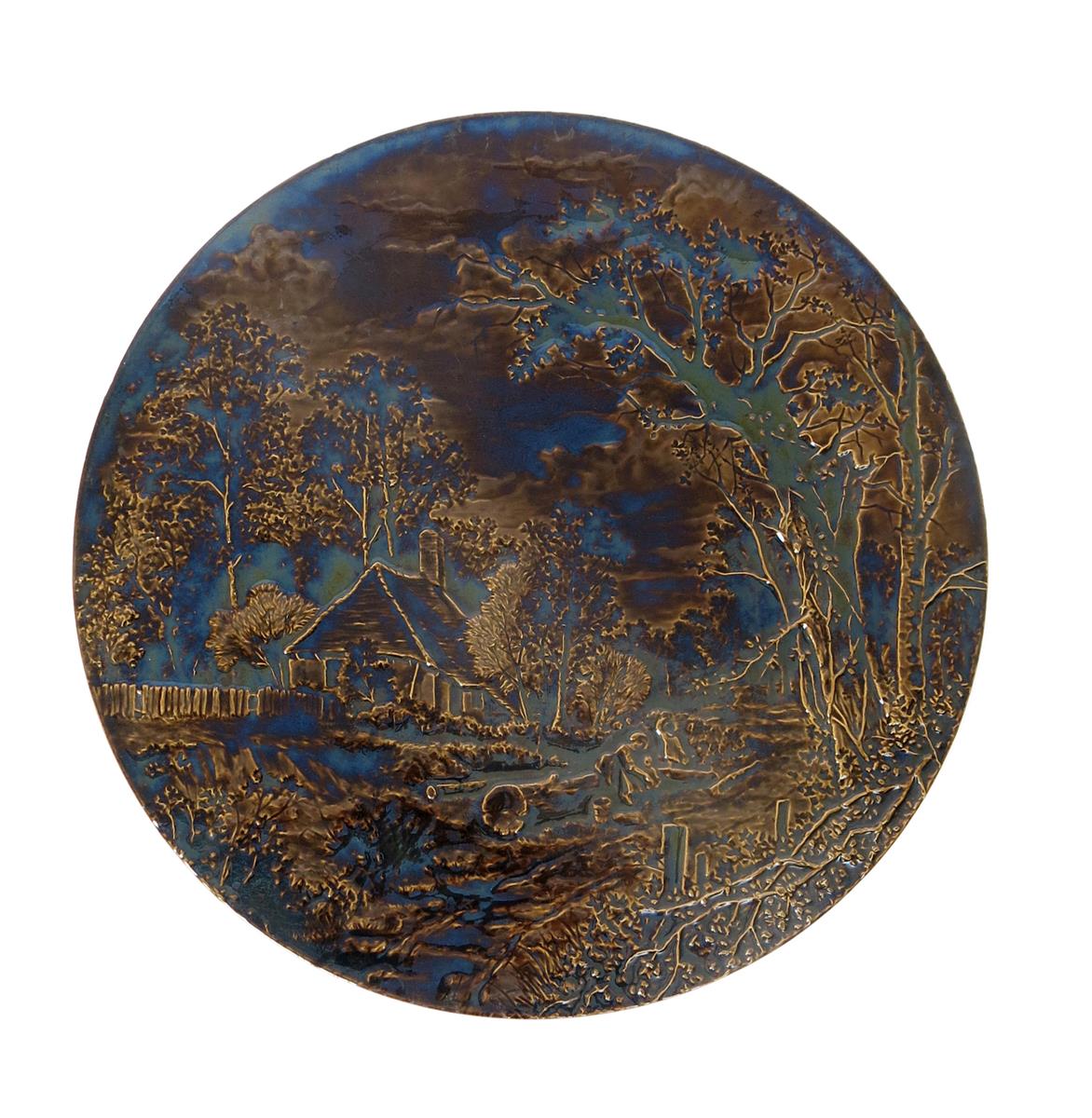 A Burmantofts Faience wall plaque by Harold Leach, model no.1126, circular, modelled in low relief with a bridge in a mountain landscape, glazed monochrome pink, and another Burmantofts Faience charger model no.1128 by Harold Leach, impressed marks, incised monogram, 44.5cm. (2).