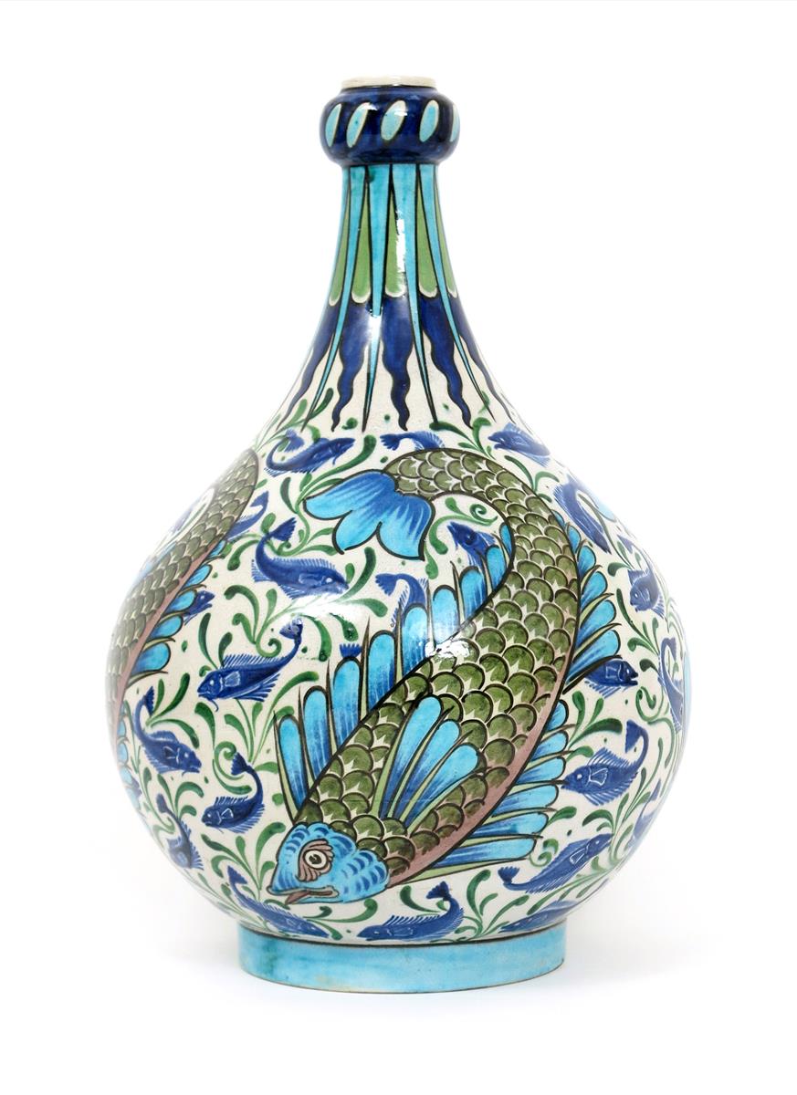 A Burmantofts Faience Anglo-Persian bottle vase by Leonard King, painted with large scaly fish amidst shoals of smaller fish, in shades of blue, green and black on a white ground, painted LK monogram, impressed BF monogram to foot rim, minor professional restoration to foot, 39.5cm. high