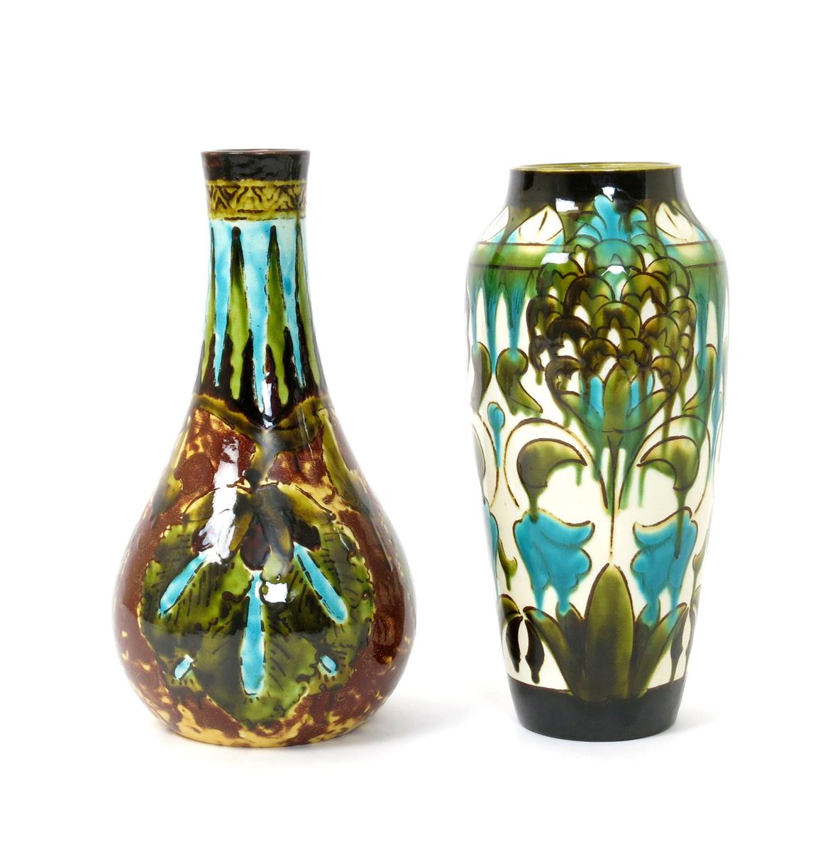 A Burmantofts Faience bottle vase, model no.1533, painted with a frieze of stylised vine foliage in green, ochre and turquoise on a pale yellow ground, and another Burmantofts Faience vase painted with flowers and foliage impressed marks, 25cm. high (2)