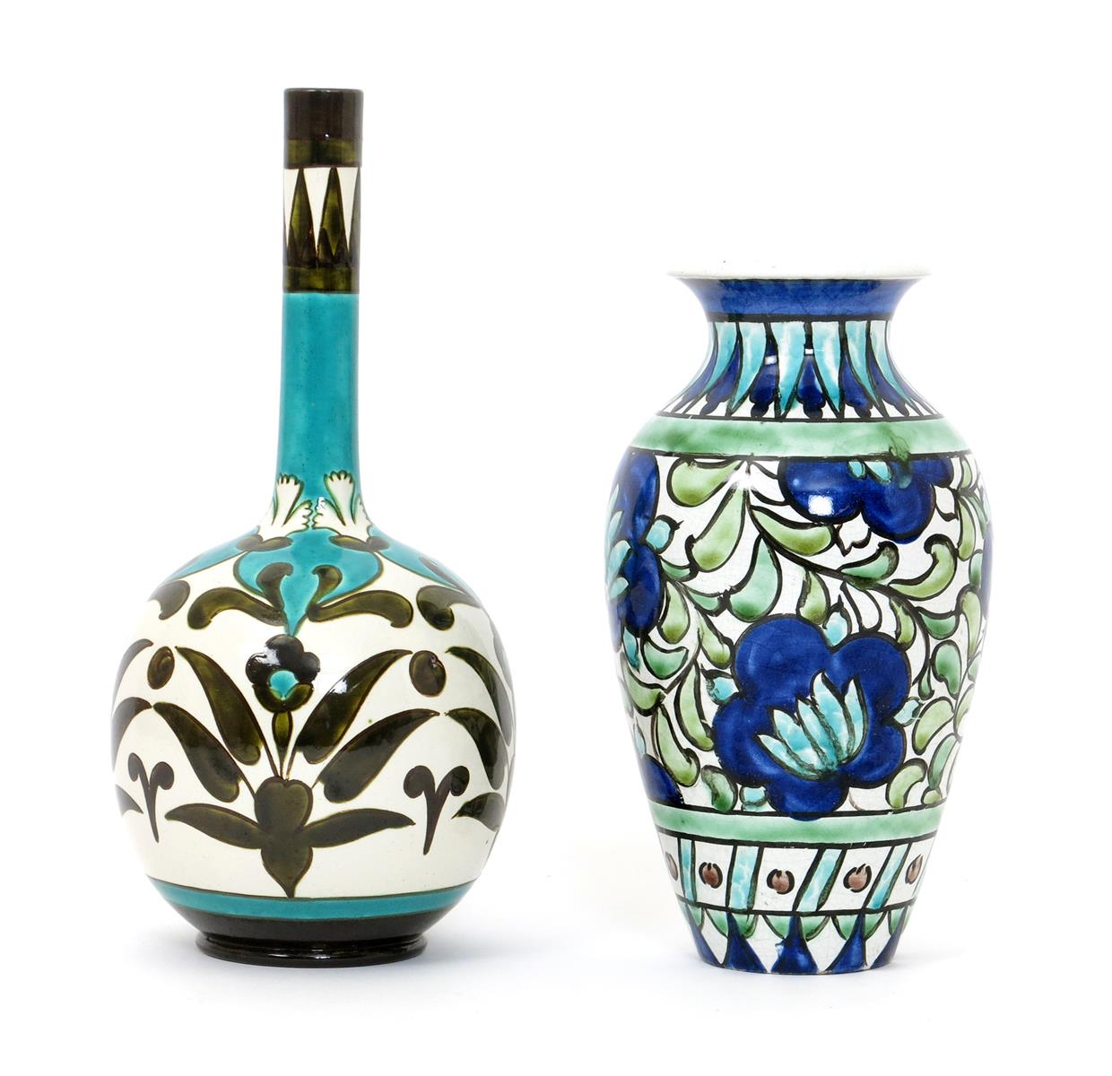 A Burmantofts Faience bottle vase, model no.107, painted with simple foliate motif in green and turquoise on a white ground, and another vase painted with flowers and foliage in a Persian palette, impressed marks, 20cm. high, (2)