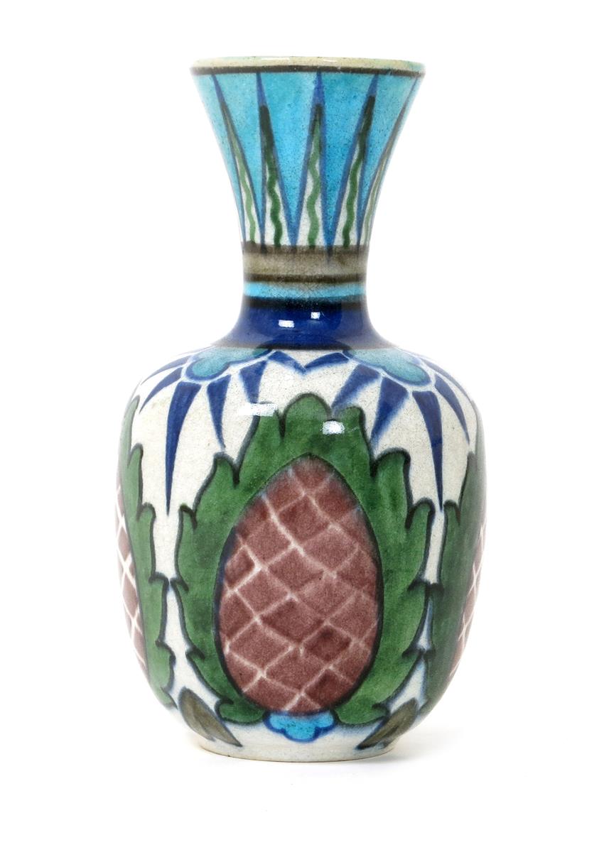 A Burmantofts Faience Anglo-Persian vase by Leonard King, model no.146, shouldered form, painted with pineapple flowers in turquoise, blue, green and aubergine on a white ground impressed marks, painted monogram, glaze flake to side, 14cm. high
