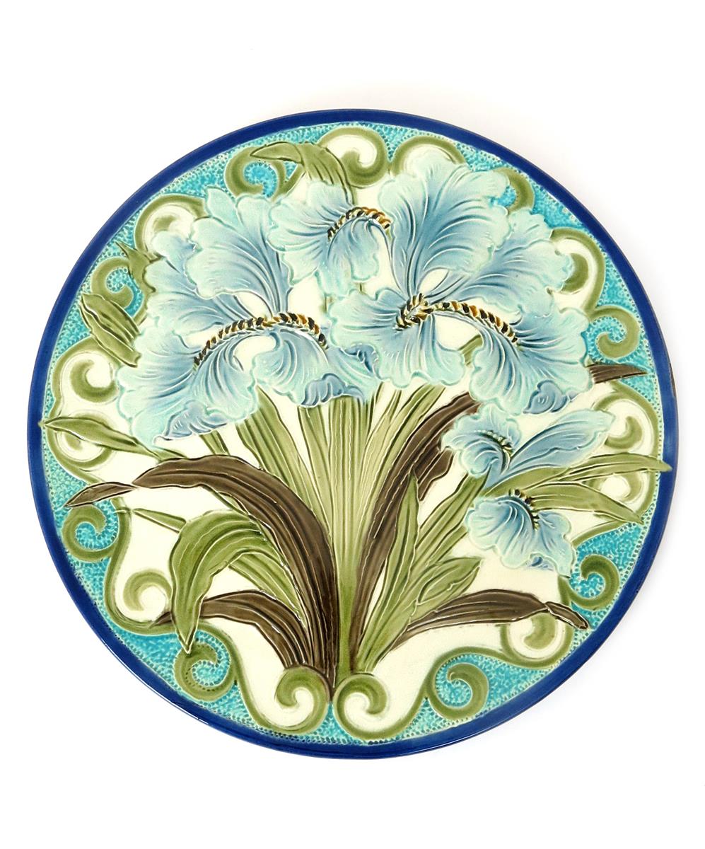 An unusual Burmantofts Faience Partie-Colour wall plaque, slip decorated with flag iris, in shades of turquoise, green and blue on a cream ground, impressed marks, incised 2309, 30.5cm. diam.