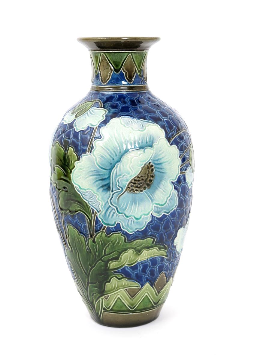 A Burmantofts Faience vase designed by Joseph Walmsley, model no.2048, shouldered form painted with blue peony flowers, painted in shades of turquoise, blue and green impressed and painted marks, 31cm. high