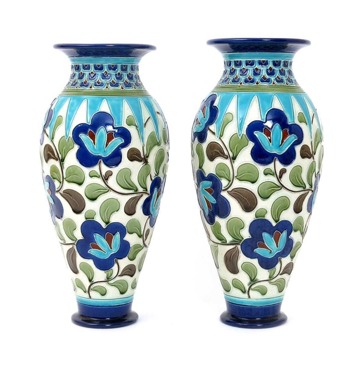 A pair of Burmantofts Faience Partie-Colour vases designed by Joseph Walmsley, slender baluster form, modelled in low relief with Iznik flowers and foliage, in shades of turquoise, blue, green and ochre on a white ground, impressed and painted marks, 32cm. high (2)