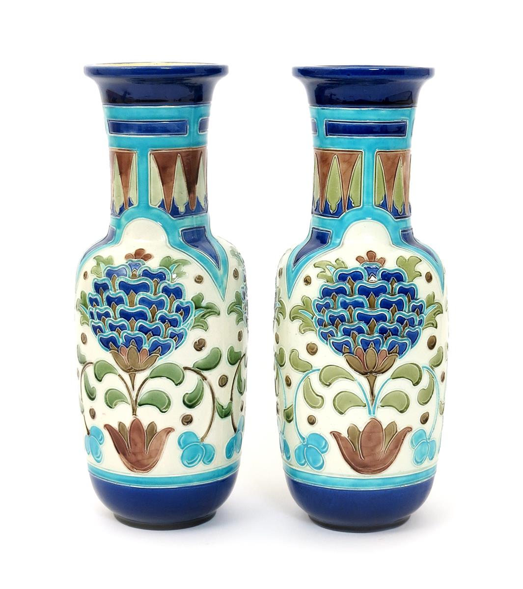 A pair of Burmantofts Faience Partie-Colour vases designed by Joseph Walmsley, model no. 2049, shouldered cylindrical form, modelled in low relief with stylised artichoke flowers, in blue, turquoise, green and mushroom on a white ground, impressed marks and painted marks, 35cm. high (2)