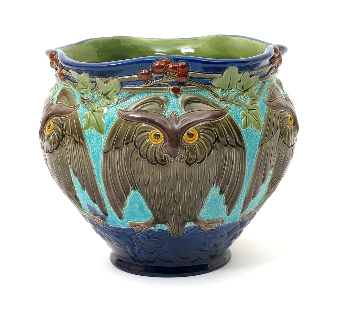 A rare Burmantofts Faience Partie-Colour jardiniere designed by Joseph Walmsley, model no. 2240, ovoid, modelled in low relief with stylised owls perched below berried vine border, glazed in shades of blue, turquoise, green, brown and yellow, impressed and painted marks, 24.5cm. high