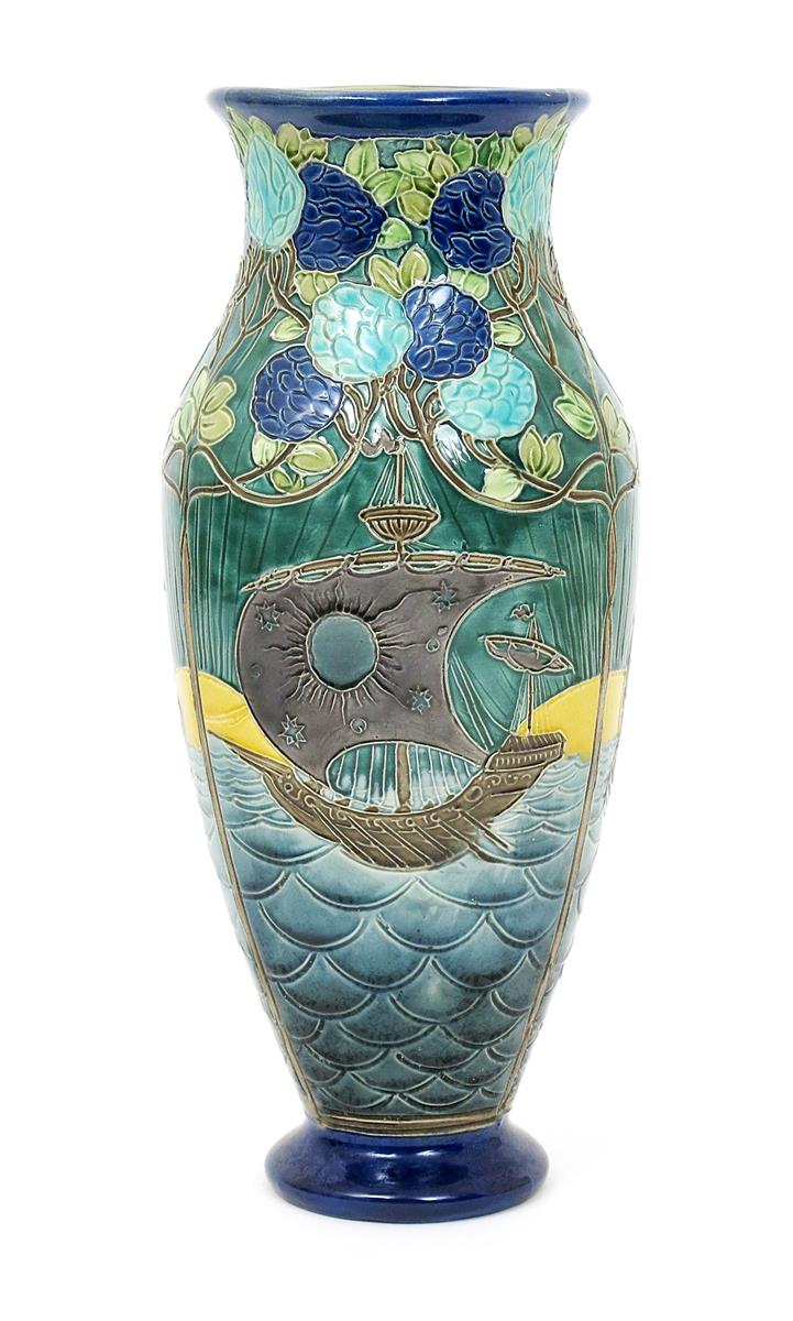 A Burmantofts Faience Partie-Colour vase designed by Joseph Walmsley, model no.2200, slender, shouldered cylindrical form, modelled in low relief with longboats at sail on a choppy sea, in the distance a sun rising on the horizon, painted in shades of blue, turquoise, green and yellow impressed marks, 34cm. high