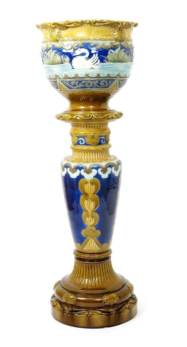 A Burmantofts Faience jardiniere and stand, model no. 2018, the ovoid bowl with flaring rim cast in low relief with scallop and scroll motif, decorated with a frieze of swans swimming on a river, in shades of blue, green and mustard, the base with similar cast scallop shells and stylised flower columns in blue, turquoise and mustard impressed marks, 88cm. high (2)