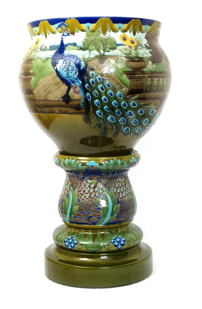 A large Burmantofts Faience Partie-Colour jardiniere and stand, model no.2115-2116, the ovoid bowl decorated in low relief with peacocks in a formal garden setting, before balustrade, the base with stylised flowers and foliage, in blue, turquoise, ochre and green, impressed factory marks, Sotheby's paper lot label, minor damages, 95cm. high (2)