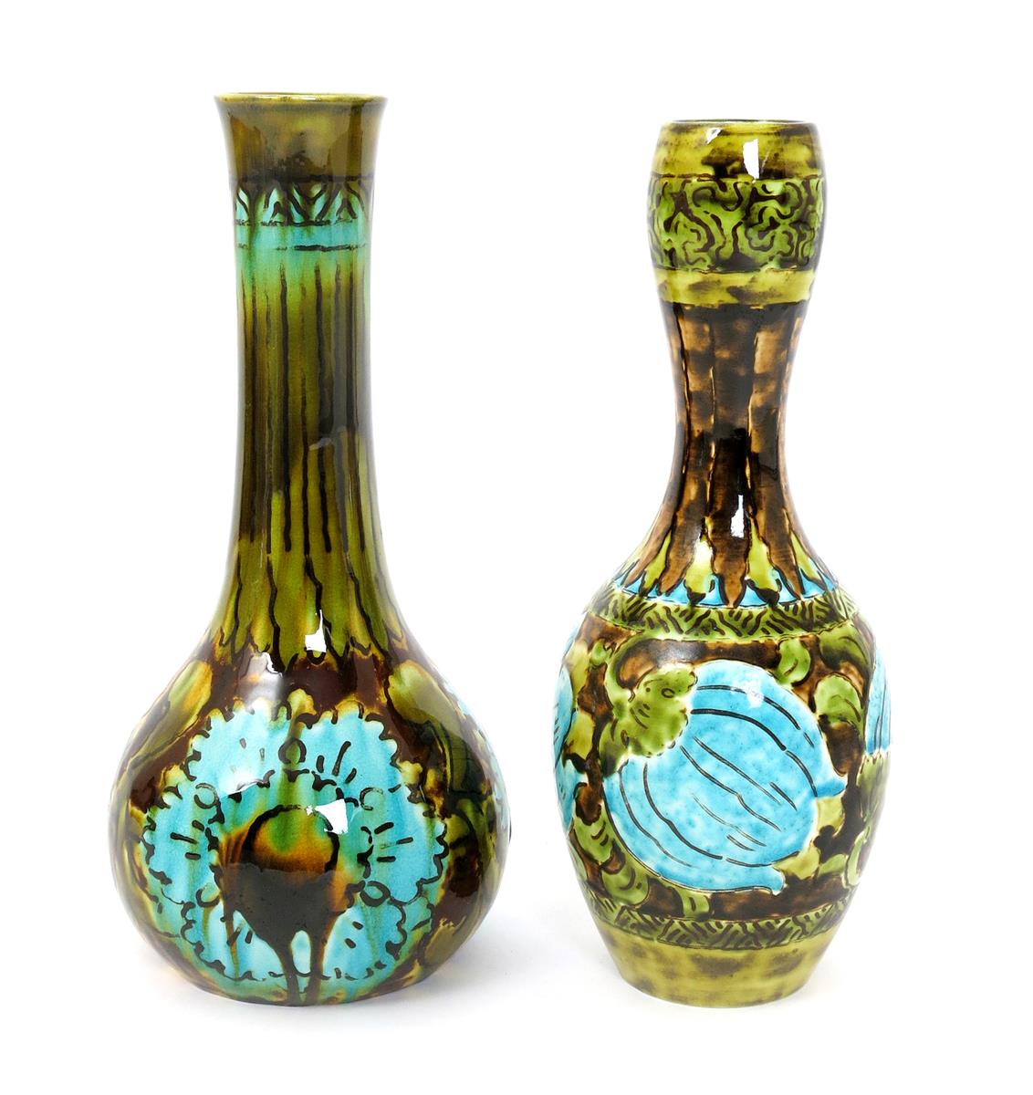An unusual Burmantofts Faience Barbotine bottle vase, model no.1529, painted with budding flowers in shades of green, brown and turquoise blue, and another similar model no.1528, impressed marks, 26.5cm. high, (2)
