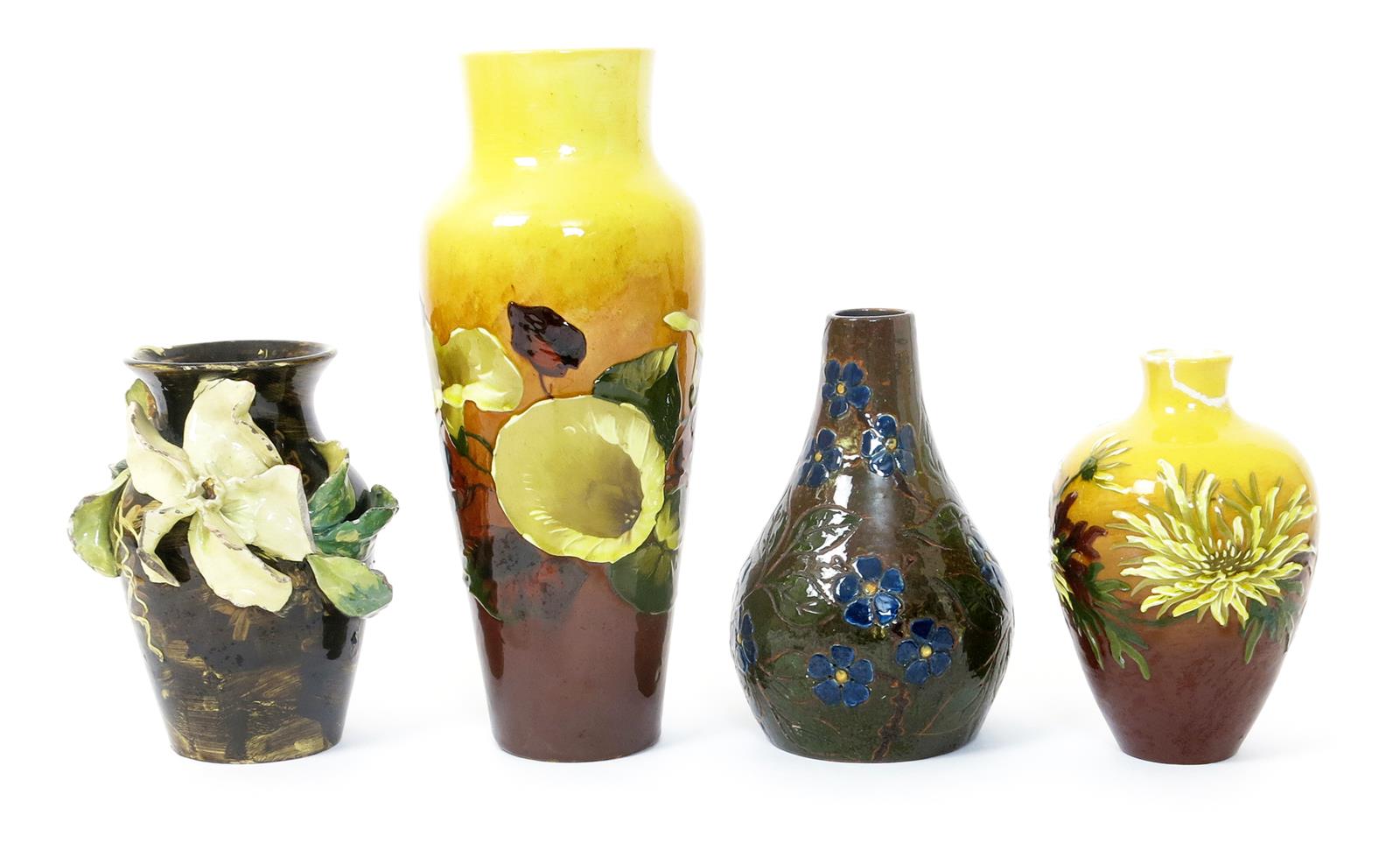 A Burmantofts Faience Barbotine vase, model no.1557, shouldered form, painted with a frieze of convolvulus flowers in colours on a yellow ground, another smaller, a Burmantofts vase with applied flowers and another vase impasto decorated with blue flowers impressed marks, glaze loss and chips, 30cm. high, (4)