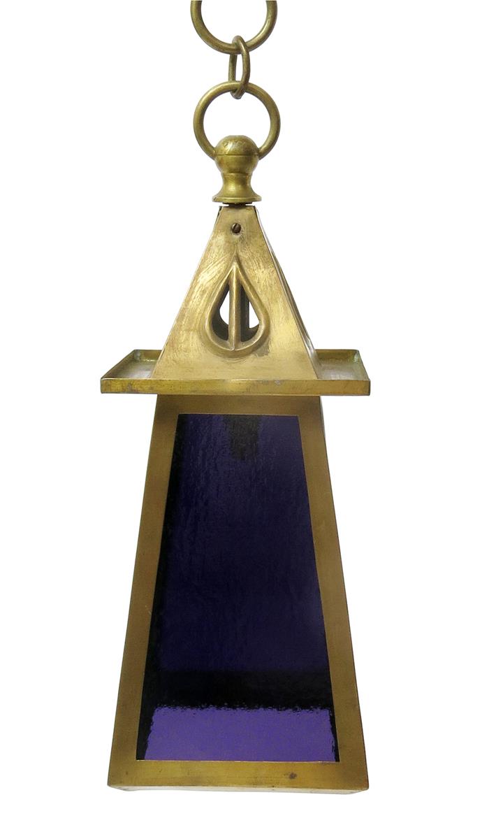 A brass hall lantern, tapering square section with triangular terminal pierced and modelled with Glasgow School teardrop panels, unsigned, 40cm. high