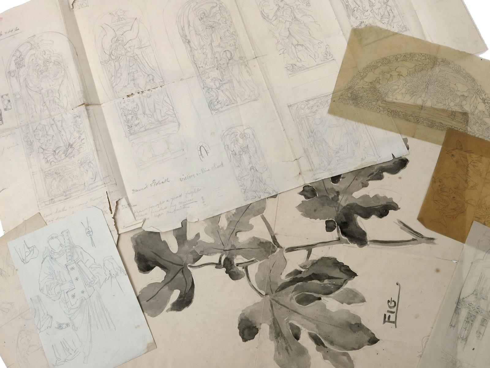 A collection of designs and promotional literature for The City Glass Company Glasgow, including designs for stained glass windows, botanical sketches and studies of saints, 75 x 48cm. (largest sheets)