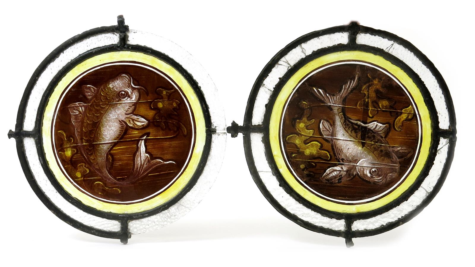 A pair of Aesthetic Movement stained glass panels, circular, each painted with a scaly fish amongst waterweed, in leaded frame with frosted glass border, unsigned, panels 15cm. diam. (2)