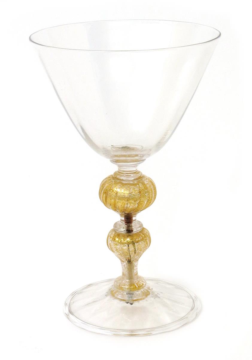 A James Powell & Sons Whitefriars embedded gold goblet vase designed by Harry Powell, the double knop stem with aventurine inclusions, on flaring foot, unsigned, repaired stem, 19cm. high