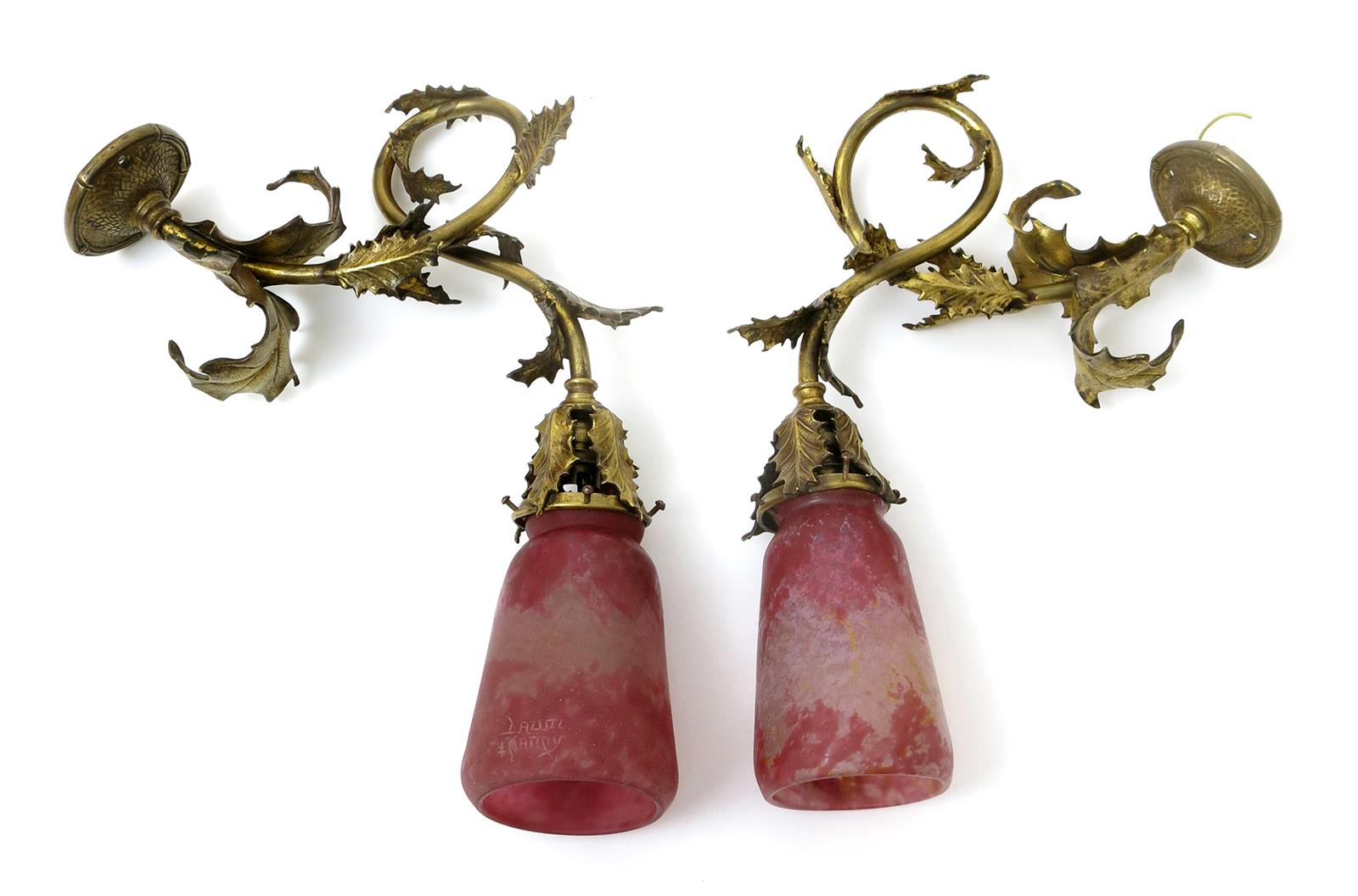 A pair of gilt metal wall lights with Daum glass shades, the scrolling shade cast with holly leaves, supporting pink glass shades, shades signed Daum Nancy, 31cm. deep (2)