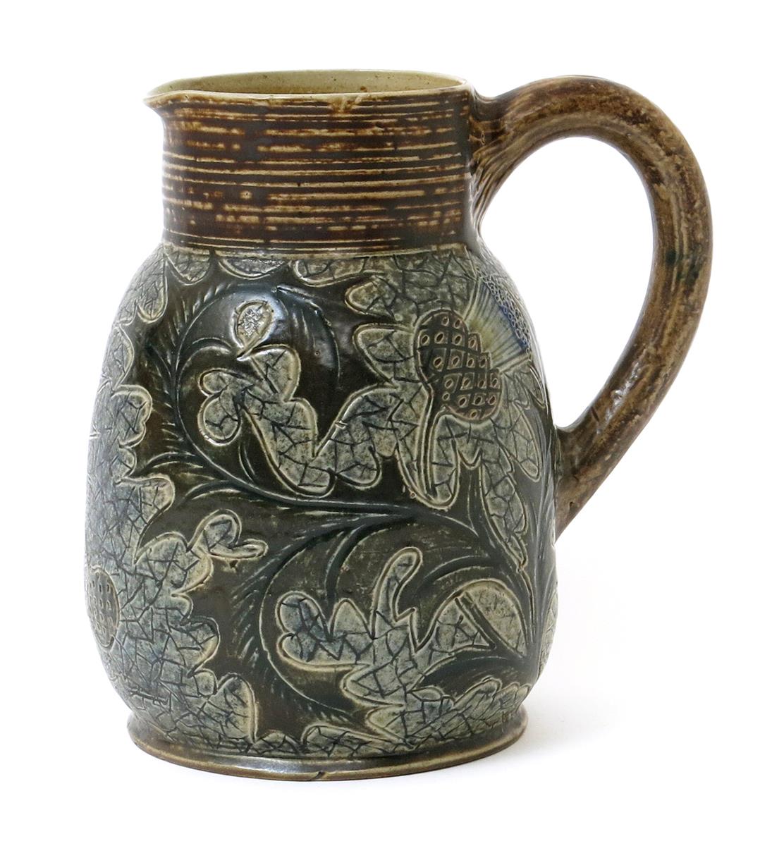 A Martin Brothers stoneware jug by Robert Wallace Martin, shouldered form, incised with thistle flowers on scrolling ground, in mushroom, green and blue on a brown ground incised 13-10-80 R W Martin London & Southall, 18.5cm. high