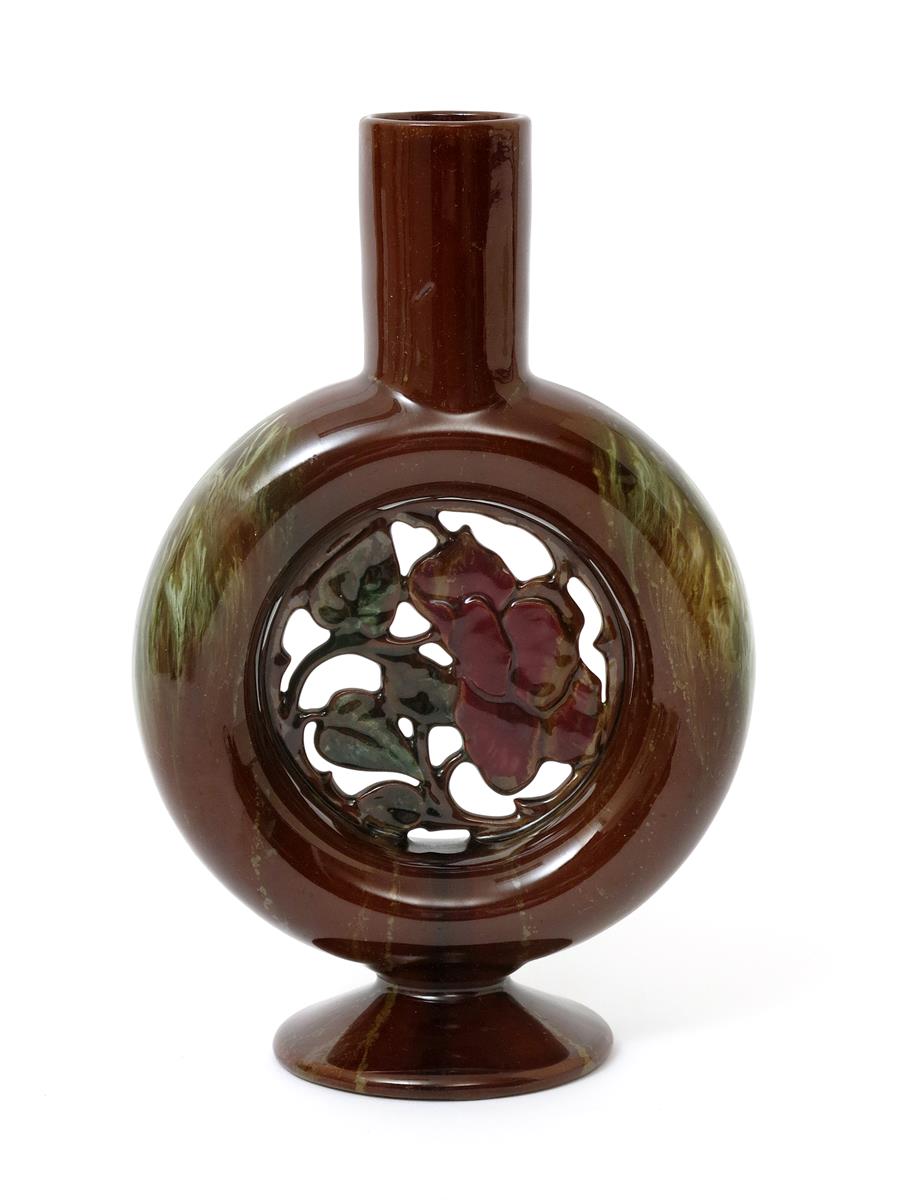 A rare Linthorpe vase designed by Dr Christopher Dresser, the tube vase with central pierced foliate roundel, glazed brown with running olive and white streaked glaze, indistinct impressed marks, 22cm. high