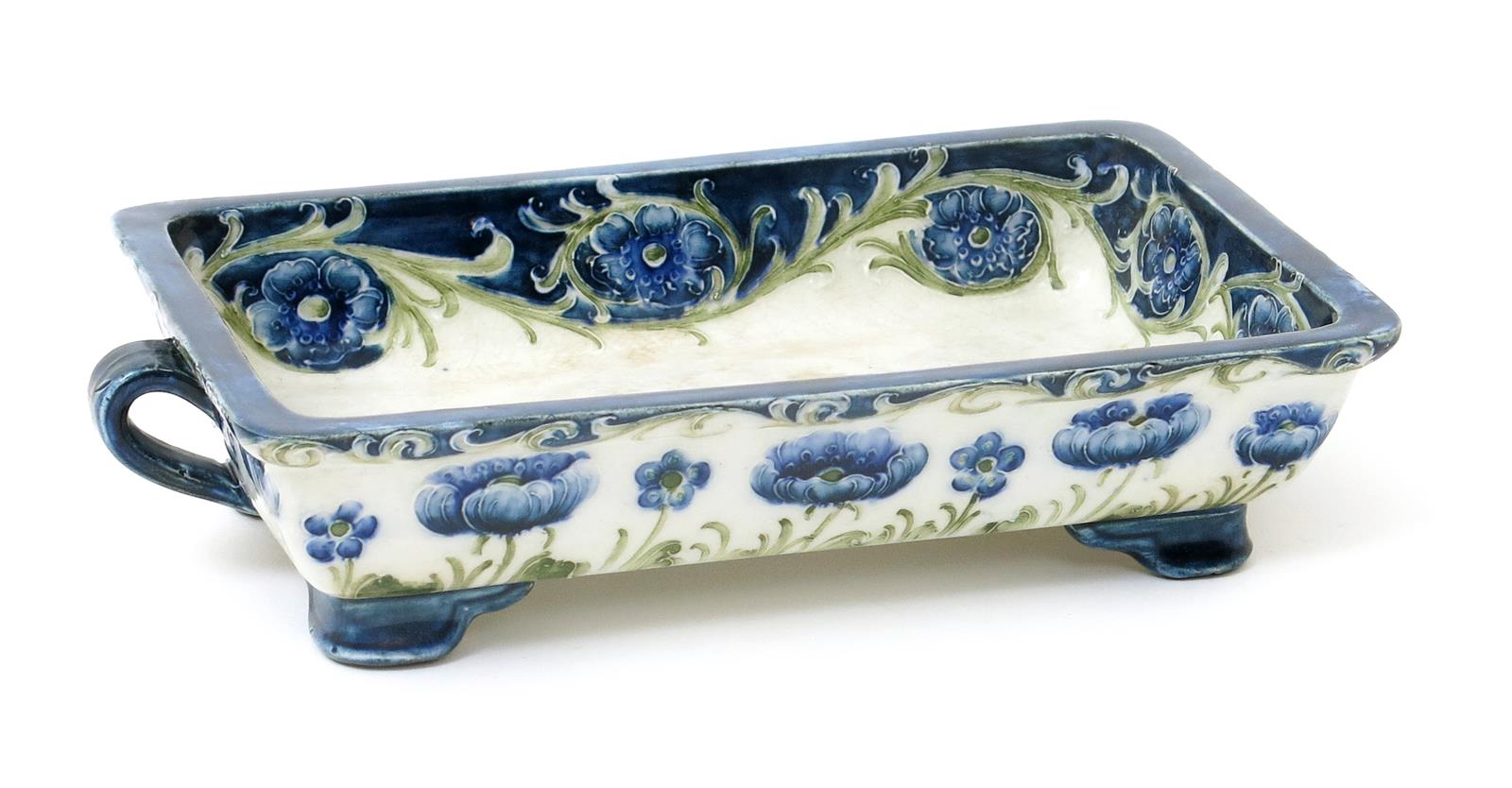 Blue Poppy an unusual James Macintyre twin-handled tray dish designed by William Moorcroft, flaring rectangular form with twin loop handles, tubeline decorated with stems of blue poppy flowers, in blue and green on a white ground, printed factory marks, painted green signature, professional restoration, 22cm. wide.