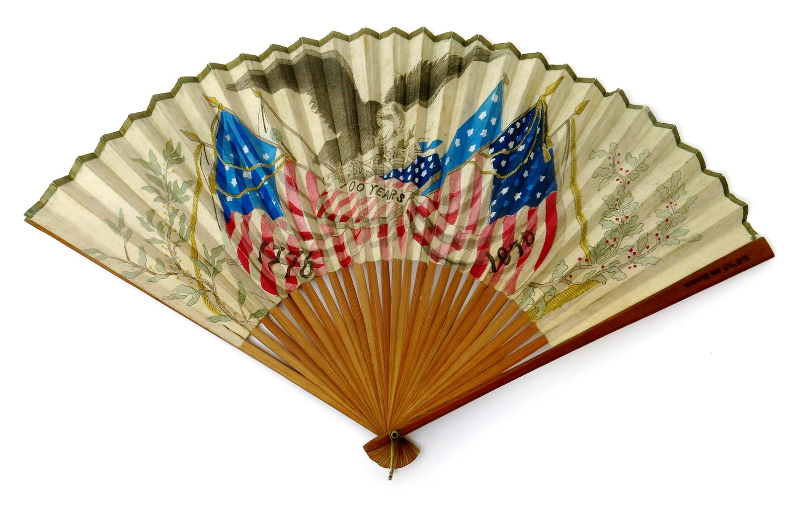 Philadelphia International 1776-1876 an advertising paper fan, on bamboo sticks, printed in colours to both sides, stamped regd mark, June 8th 1875, 27cm. long.