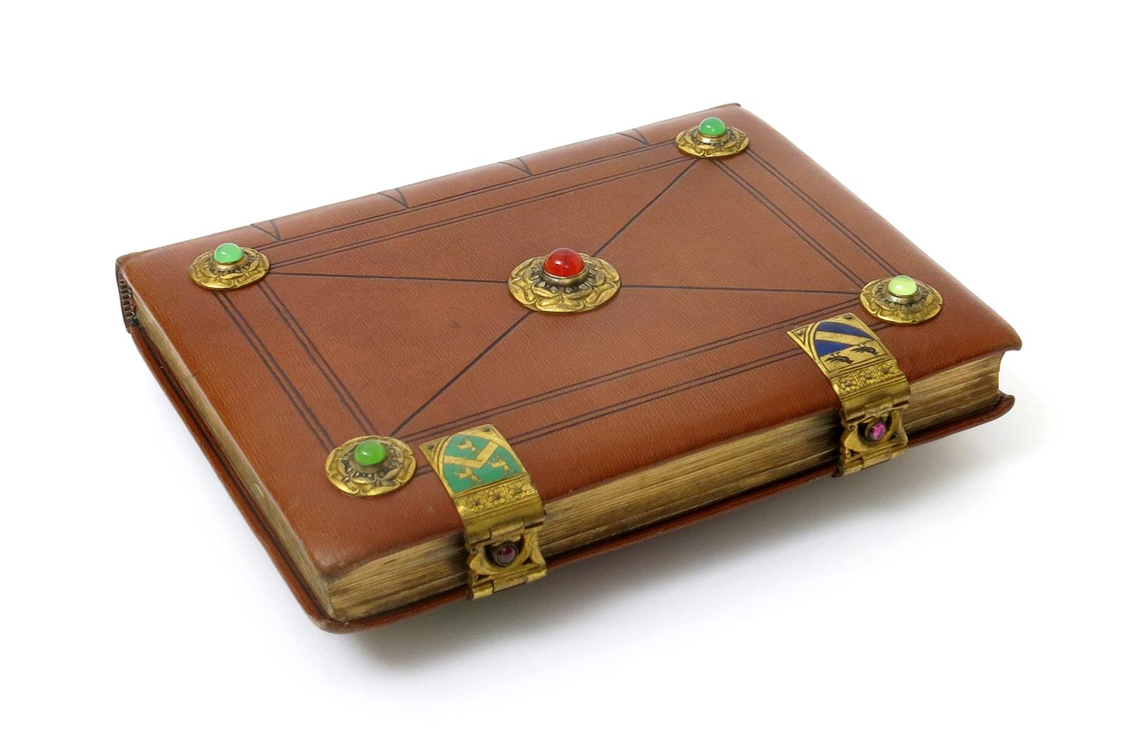 The Common Book of Prayer a tan morocco leather bound prayer book with binding designed by William Burges, the brown leather binding set with five gilt metal English Rose studs set with semi-precious stones and gilt metal clasps enamelled with the coat of arms of Lord and Lady Ripon, the metalwork by Jes Barkentin, silk end papers, 19 x 15cm.