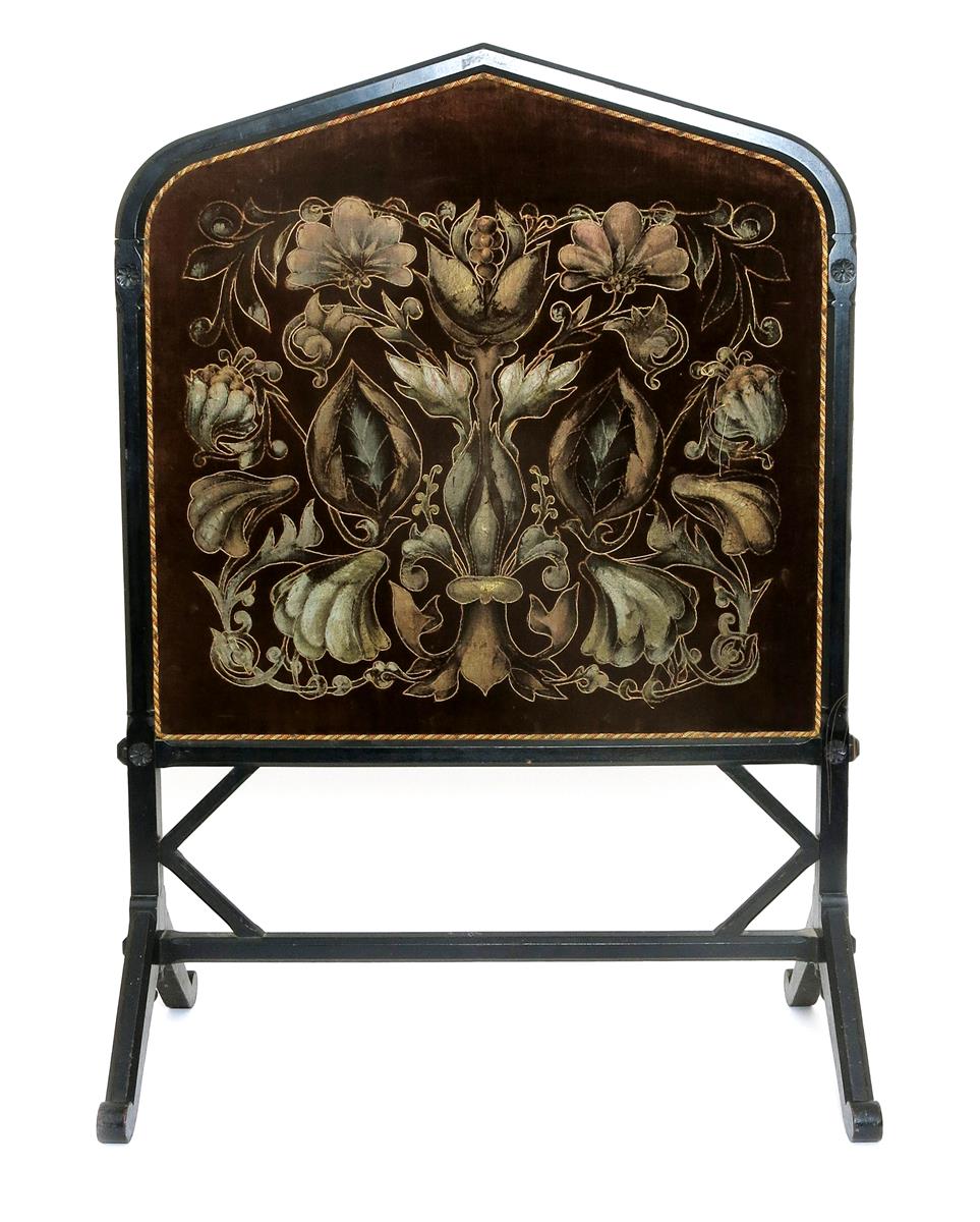 An ebonised wood fire screen in the manner of J.P. Seddon