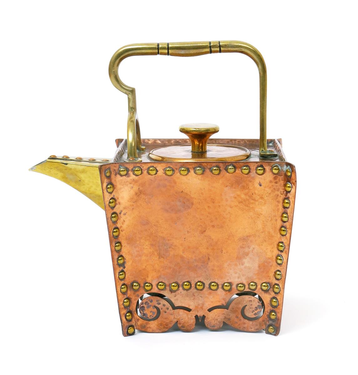 A Benham & Froud copper and brass kettle and cover designed by Dr Christopher Dresser, flaring square section with over-slung brass handle, the body with pierced foot, unsigned, 21cm. high