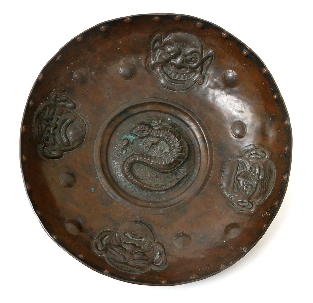 A repousse hammered patinated copper bowl in the manner of John Pearson, the well hammered with a roundel of a lizard about to attach a beetle, the rim with four Japanese mask panels, and stud border, unsigned, 28cm. diam.