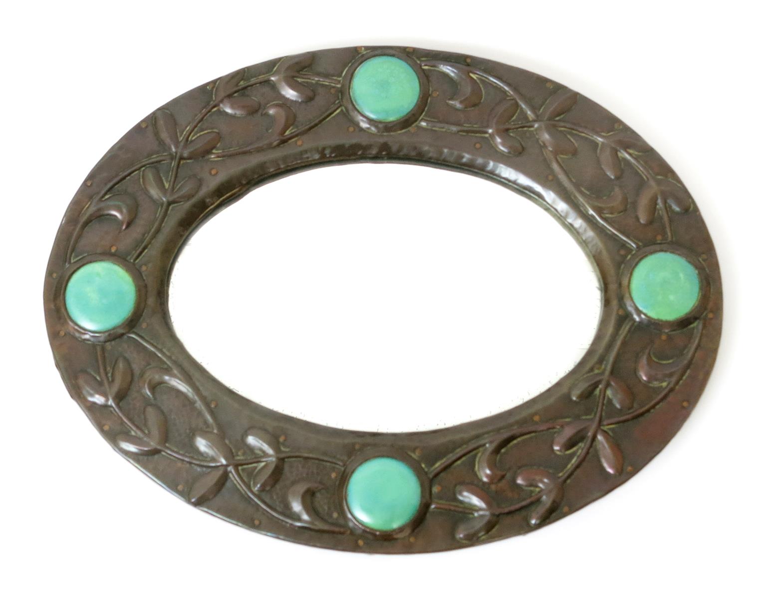 A patinated copper wall mirror attributed to John Pearson, oval, hammered in relief with a simple foliate spray and set with four turquoise glazed ceramic roundels, unsigned, 44cm. wide