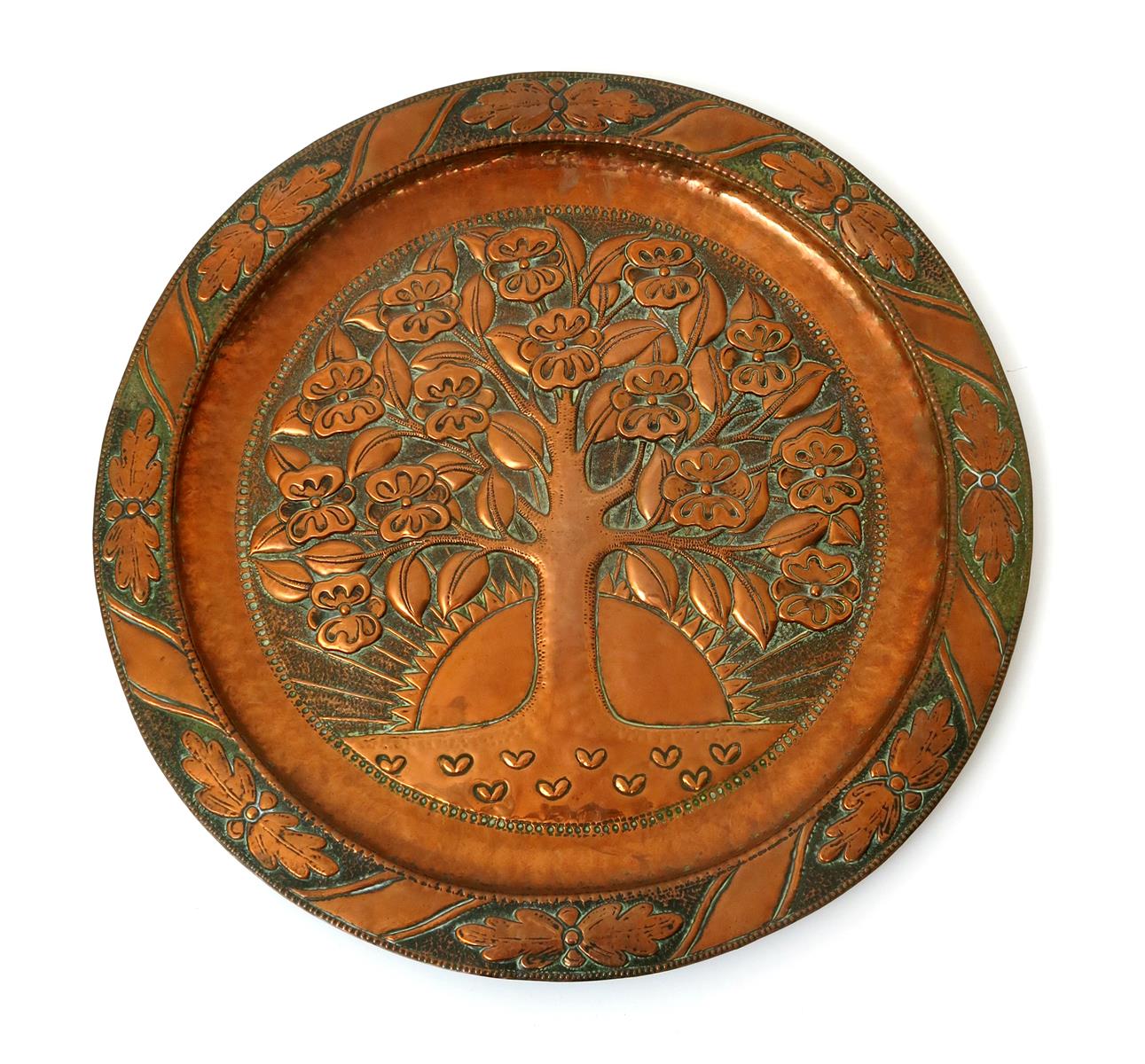 A large John Pearson repousse copper wall charger, dated 1897, the well decorated with a stylised blossom tree before a rising sun, the rim with a band of flowerhead decoration, stamped J Pearson, 1897, 51.5cm. diam.