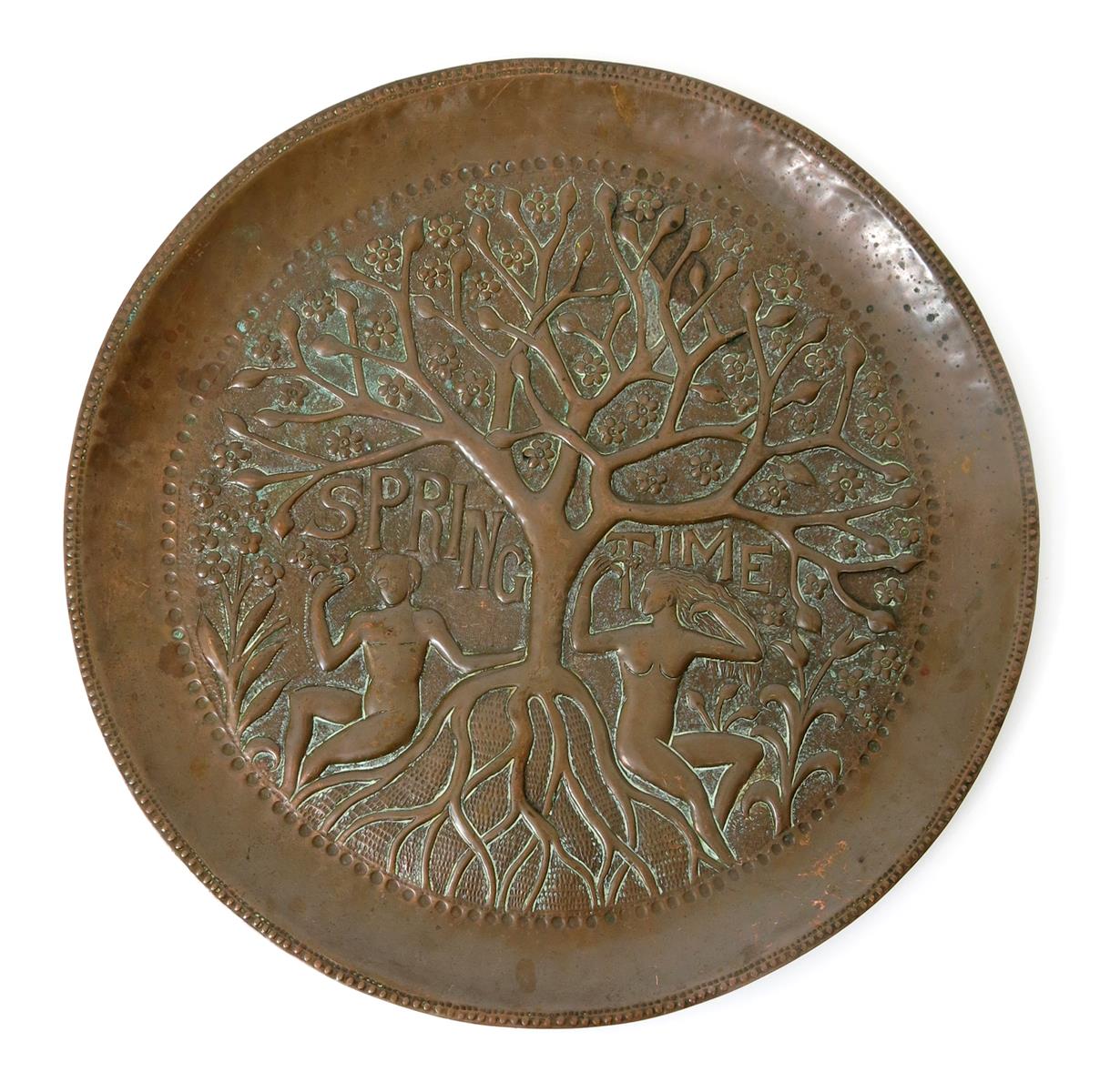 A John Pearson patinated repousse copper charger dated 1898, circular, hammered in relief with Adam & Eve below a flowering tree, titled Spring Time, etched J Pearson 1898, numbered 2401, 31cm. diam.