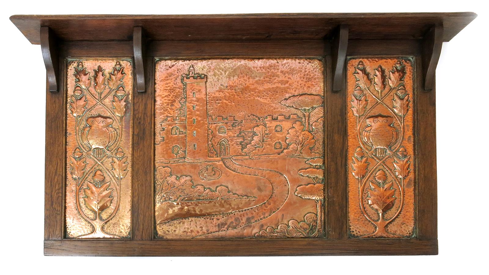 A large John Pearson repousse copper overmantel, in oak frame, the central rectangular panel hammered in relief with a castle in a landscape with winding path, flanked by two rectangular panels of owls perched amongst oak leaf and acorn sprays, indistinct marks to reverse, 117 x 68cm. (central panel 47 x 56cm)
